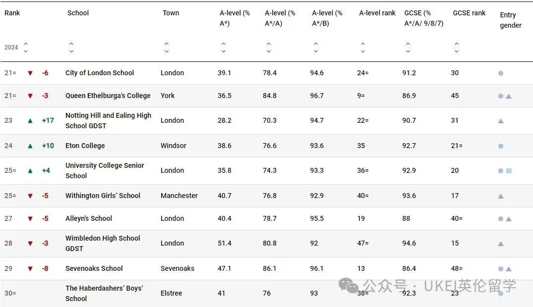 伊顿公学(Eton College)同样实现两位数跃升,重回前 25。