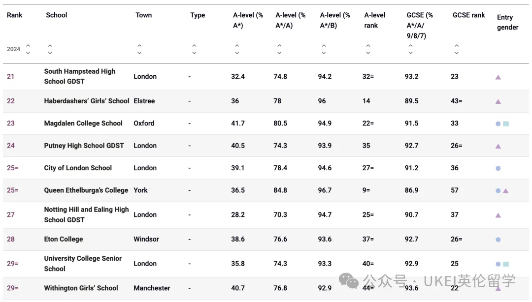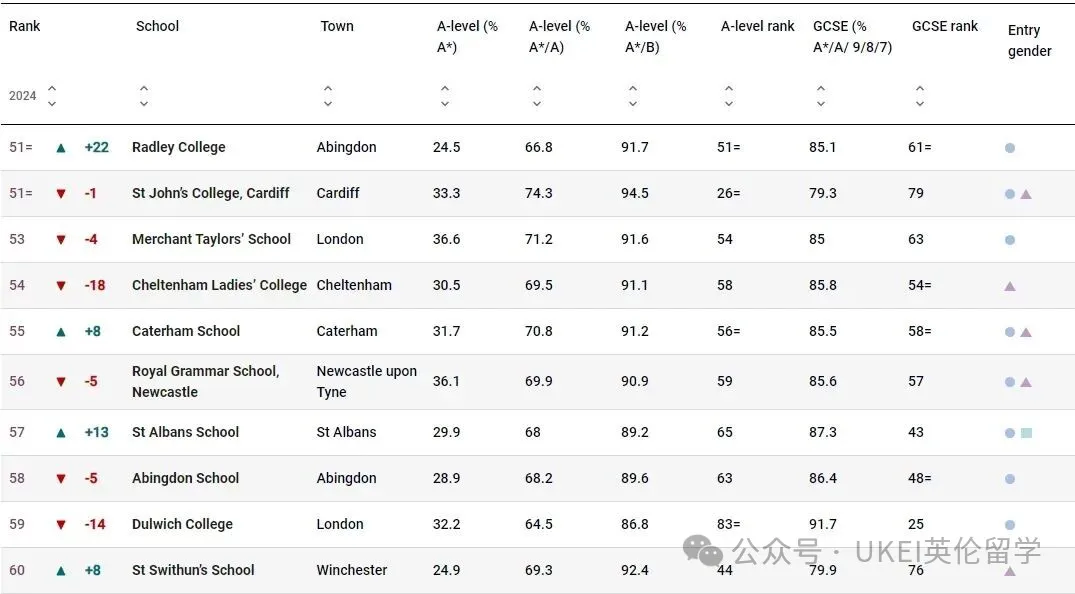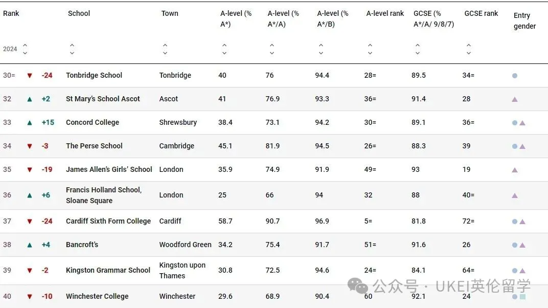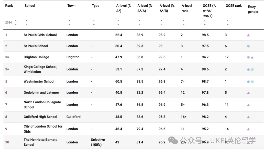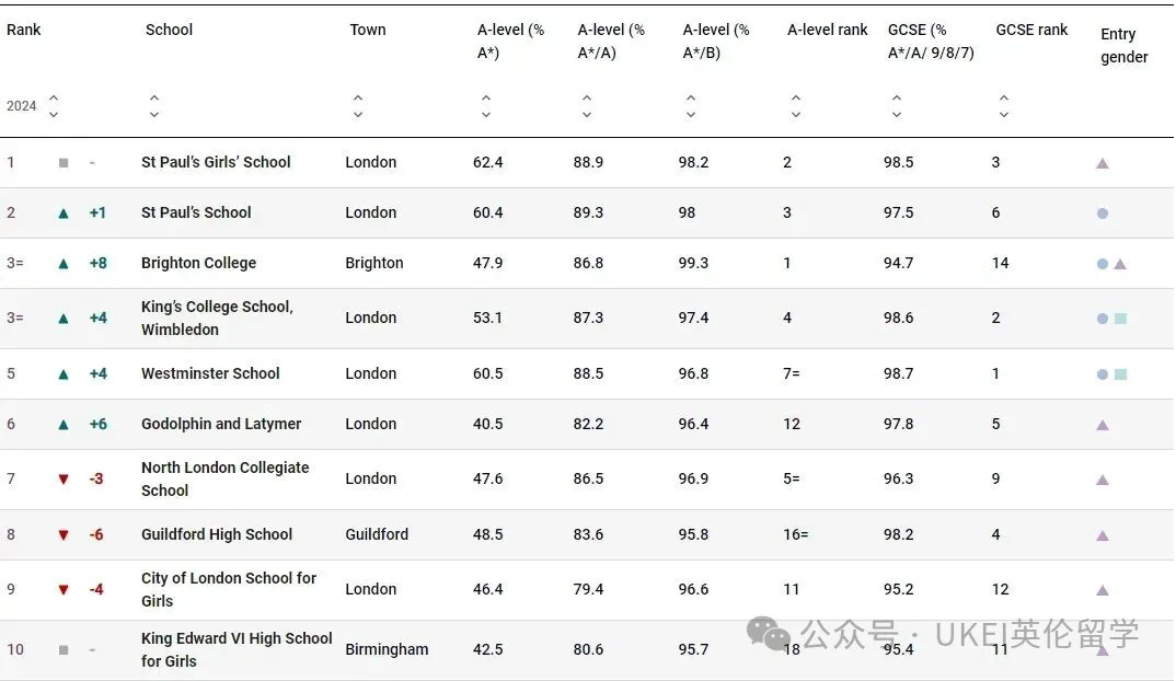 男校方面,圣保罗公学(St Paul’s School)以全国第二的成绩领跑。