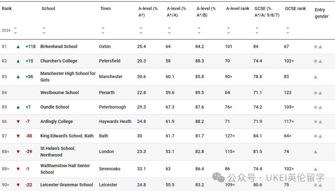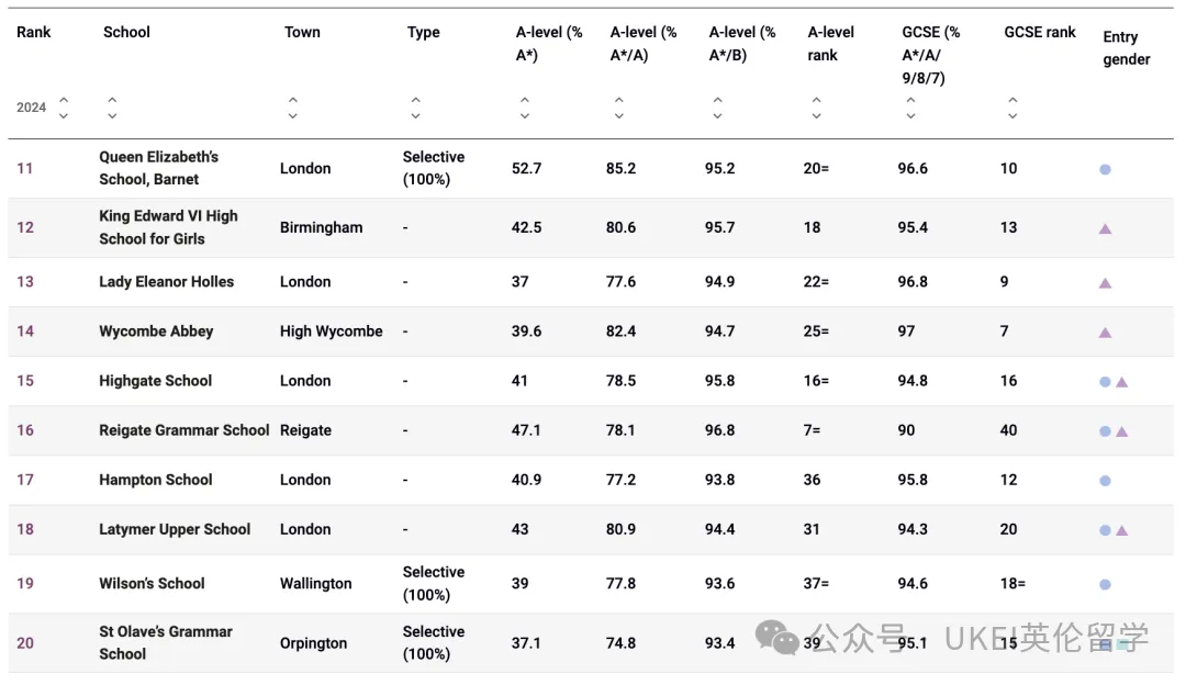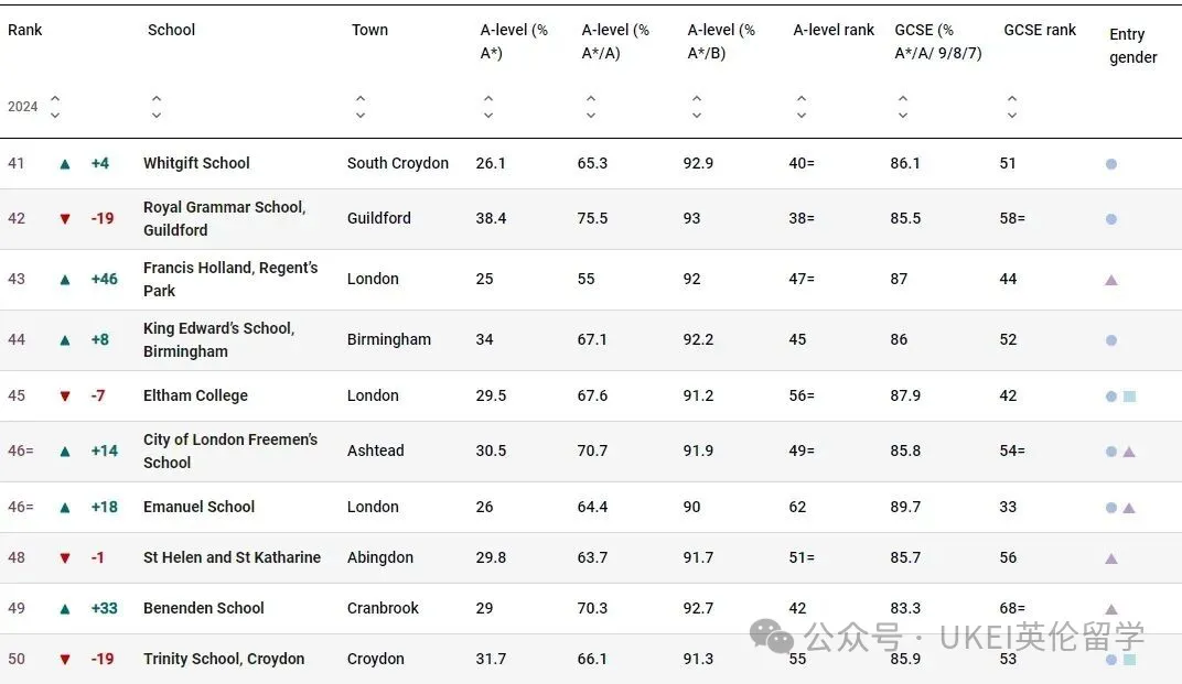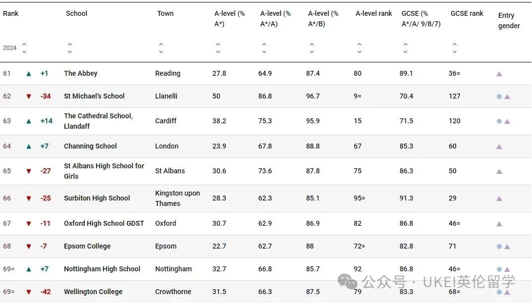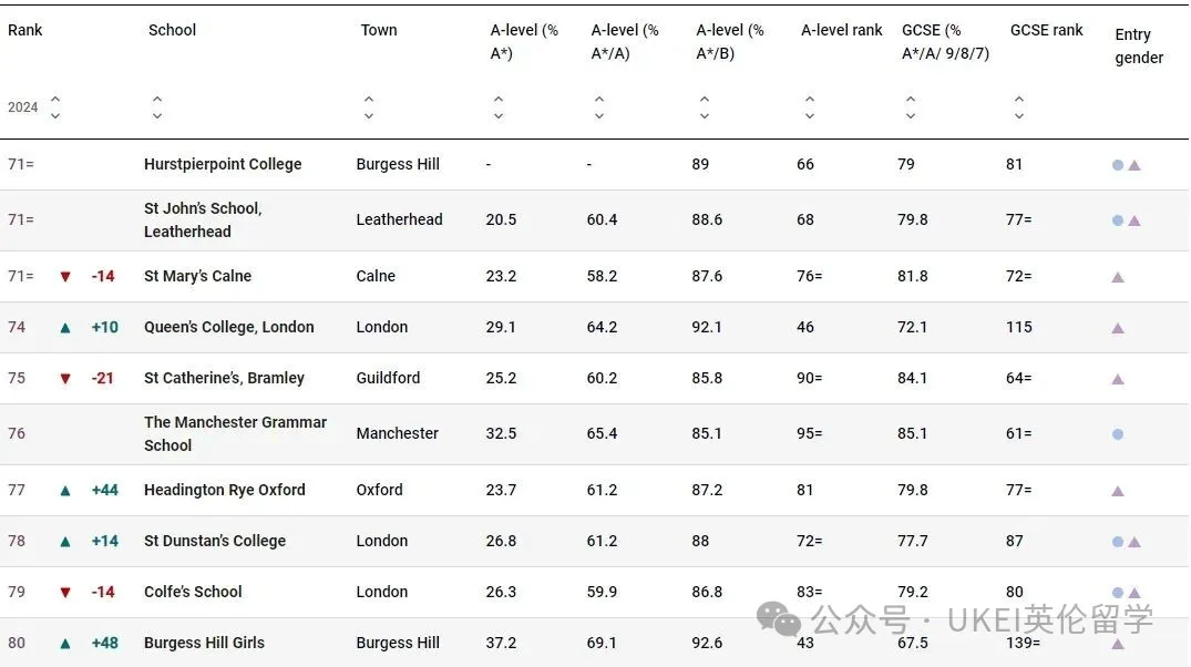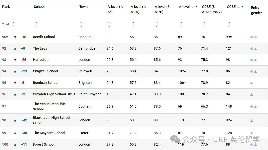 男校方面,圣保罗公学(St Paul’s School)以全国第二的成绩领跑。