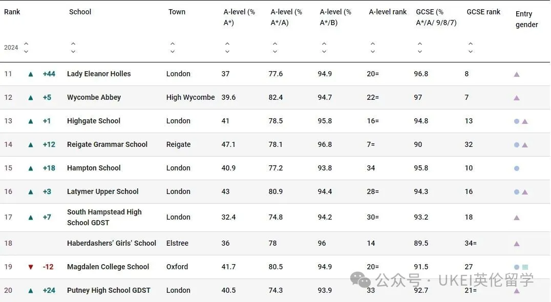 威雅公学(Wycombe Abbey)大幅前进 5 位,升至第 12;